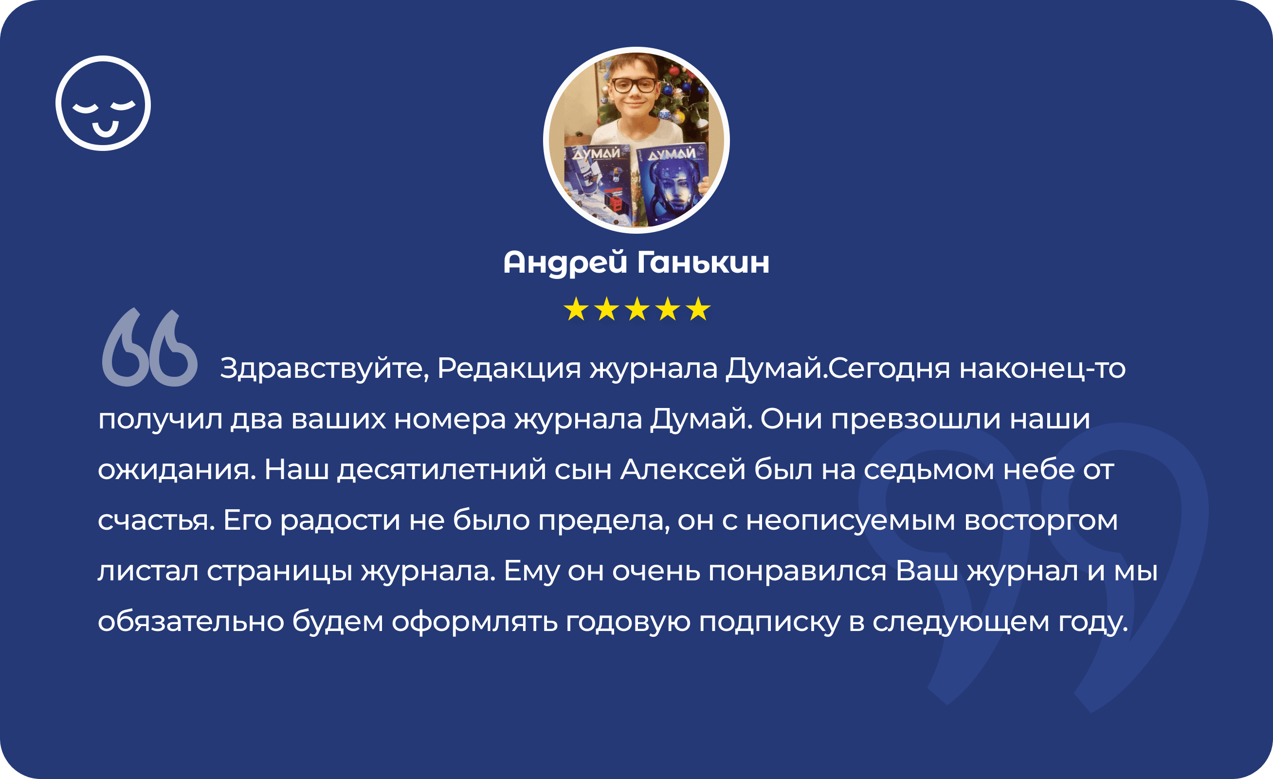 Если вы хотите приобрести подписку в подарок, обязательно скачайте подарочный сертификат и торжественно вручите его новому обладателю подписки на журнал «ДУМАЙ 12+».